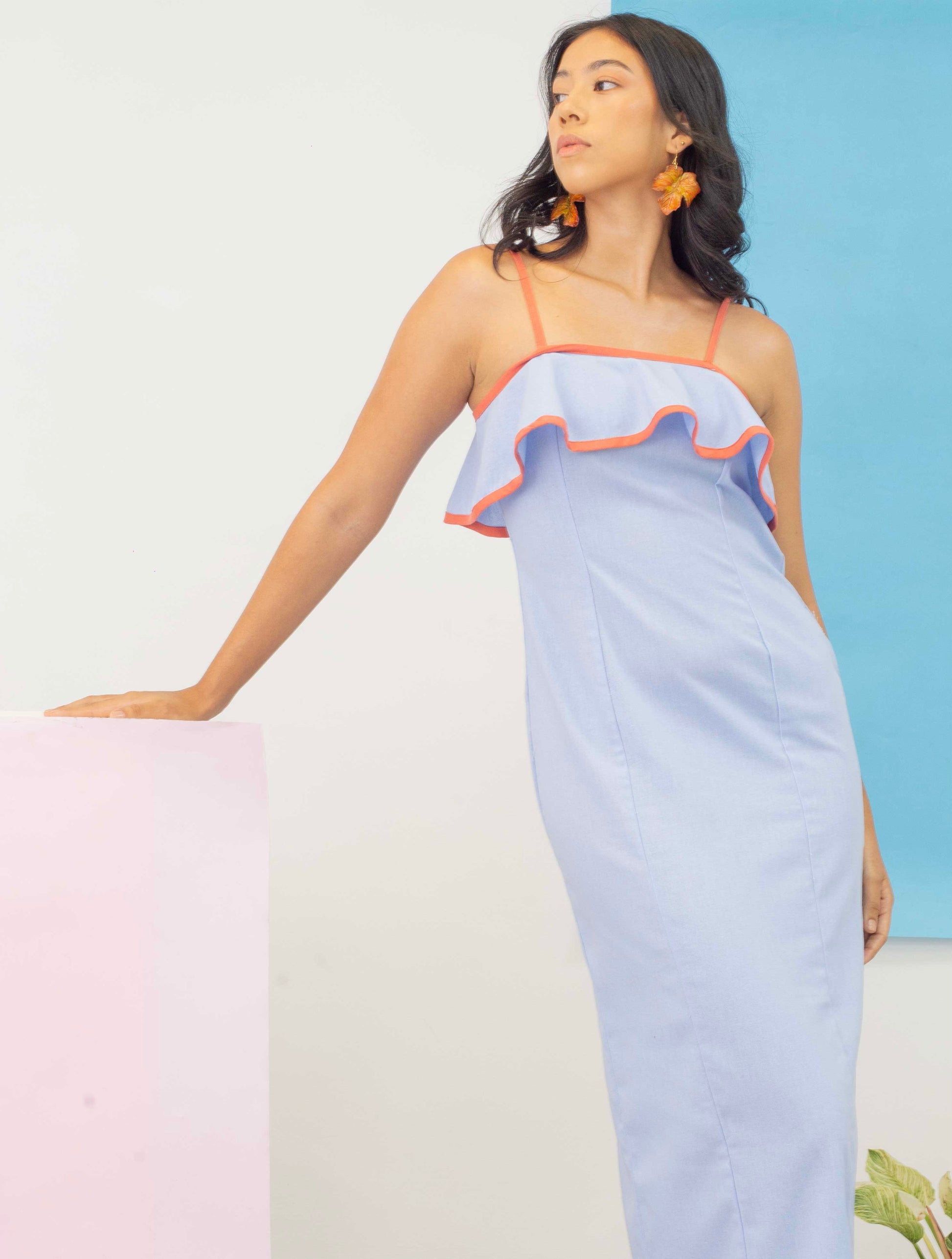 El vestido Amira es una propuesta divertida y femenina confeccionada en lino. Su diseño midi en tono celeste resalta por el detalle de volantes en el escote, delineados con un vivo color ladrillo que le aporta un toque vibrante y único.